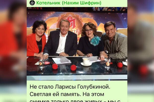 Звезда отечественного кино, театра и эстрады Ефим Шифрин отреагировал в соцсетях на смерть народной артистки РСФСР Ларисы Голубкиной