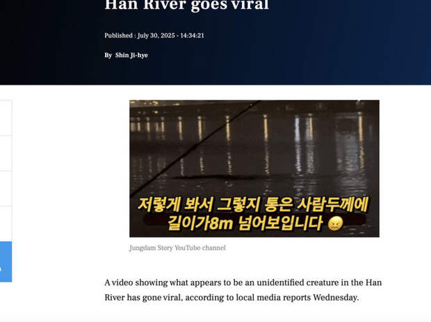Житель Сеула, отправившись на рыбалку к реке Хан, стал свидетелем необычного явления — на поверхности воды он заметил крупный объект, который привлек его внимание и вызвал тревогу
